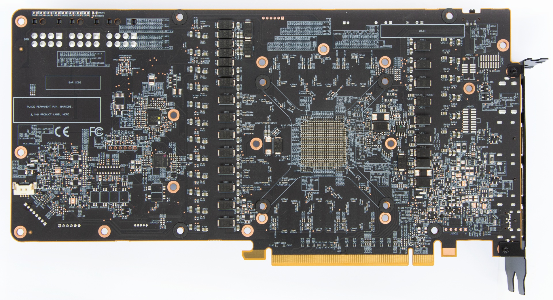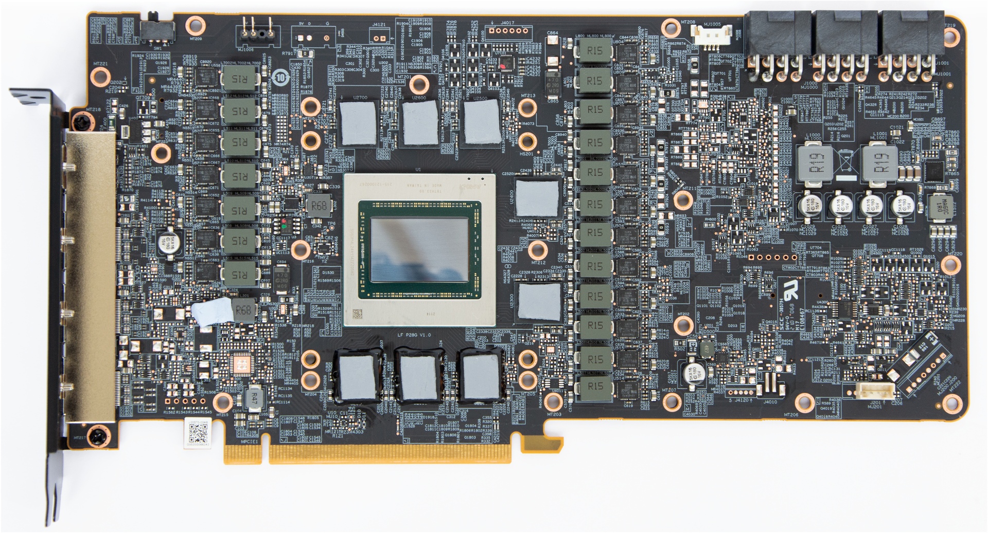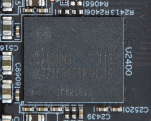 Распаяны микросхемы памяти Samsung K4ZAF325BM-HC16, объем видеобуфера составляет 16 гигабайт.