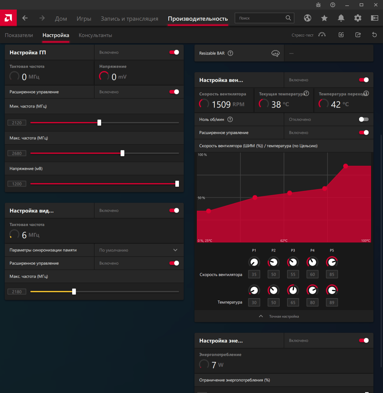 Начальные частоты PowerColor Red Devil Ultimate на том же уровне, что показывала разогнанная AMD Radeon RX 6800 XT референсного дизайна. Дополнительный разгон позволяет выжать еще больше. Для этого мы использовали исключительно программные средства, доступные в меню настройки GPU в стандартном наборе программного обеспечения AMD. Наша итоговая конфигурация настроек отражена ниже.