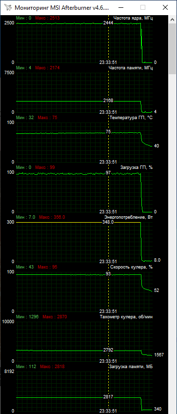 Средний Boost в играх подрос до 2440–2500 МГц. При наших настройках скорость вентиляторов держалась в рамках 2800 об/мин при температуре GPU до 75 °C.