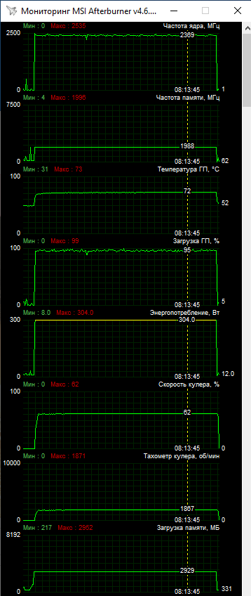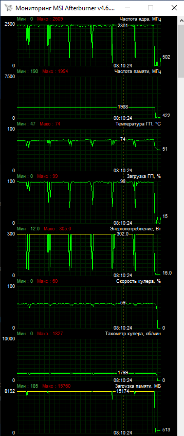 Средний Boost в играх подрос до 2440–2500 МГц. При наших настройках скорость вентиляторов держалась в рамках 2800 об/мин при температуре GPU до 75 °C.