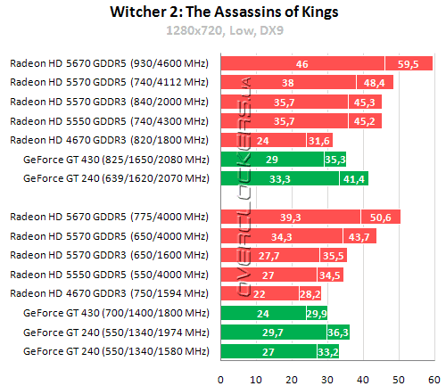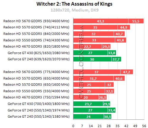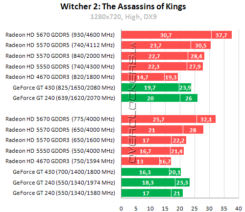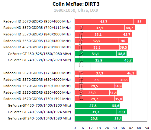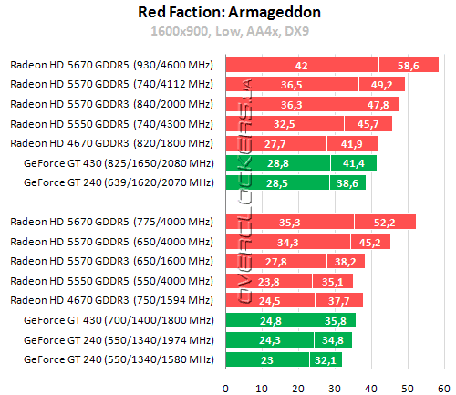 Безоговорочным лидером является Radeon HD 5670. От него на 15–18% отстает Radeon HD 5570 GDDR5, который оказывается быстрее GeForce GT 240 на 3,5% (речь о карте с памятью 2 ГГц). Остальные карты AMD уступают даже более «медленной» версии GeForce GT 240 с памятью 1580 МГц. Radeon HD 5550 обходит GeForce GT 430 на 0,7% по среднему fps, но уступает почти 4% по минимальному показателю. Radeon HD 5570 GDDR3 уступает собрату с памятью GDDR5 в производительности примерно 21%. Разогнанные младшие Redwood без проблем обходят GeForce GT 240. Хотя последний при разгоне тоже демонстрирует хороший прирост, но до уровня Radeon HD 5670 все равно не дотягивает.
