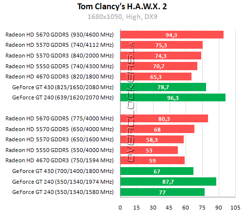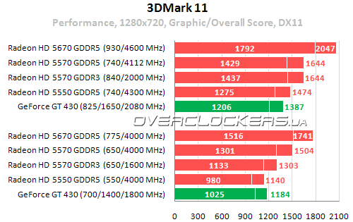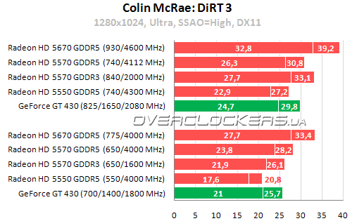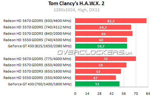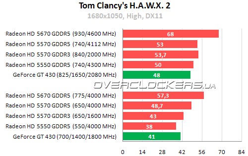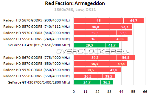 В DirectX 11 GeForce GT 430 не выдерживает конкуренции с Radeon HD 5550, проигрывая 6–7% производительности. При разгоне этот представитель NVIDIA почти нагоняет работающий в номинале Radeon HD 5570 GDDR3. Для разрешения 1360x768 достаточно любой видеокарты, а с 1600x900 при номинальных частотах не справляются GeForce GT 430 и Radeon HD 5550.