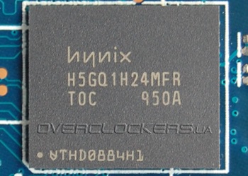 Карта оснащена 512 МБ видеопамяти — четыре микросхемы Hynix H5GQ1H24MFR T0C, которые рассчитаны на частоту в 4 ГГц.