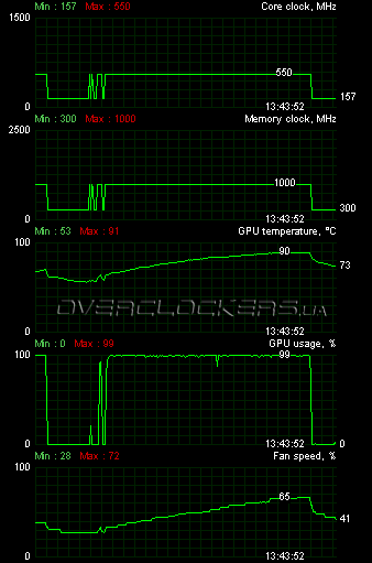 Очень хороший прирост относительно номинала и отличные показатели на фоне обоих Radeon HD 5570. Правда пришлось выкручивать обороты вентилятора на 100%, и шум его был уже довольно громким. Характеристики тестируемых видеокарт