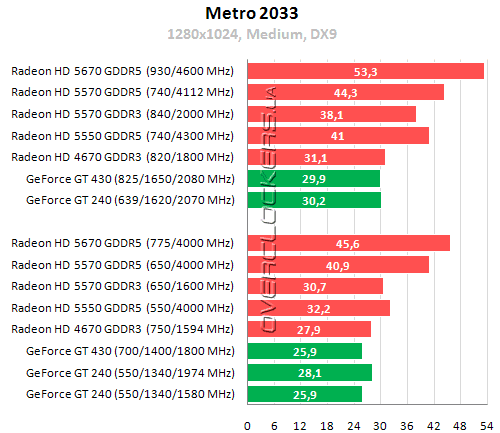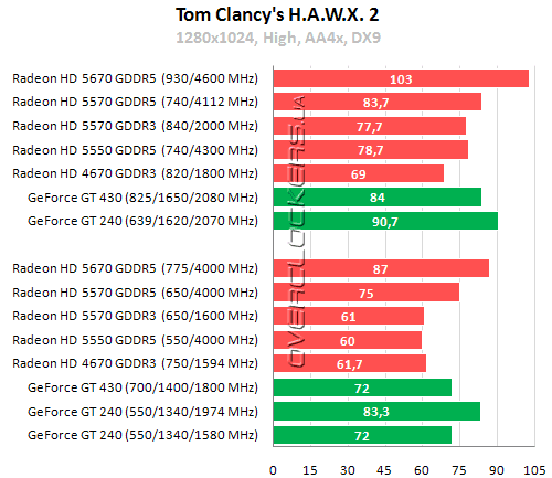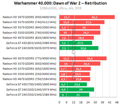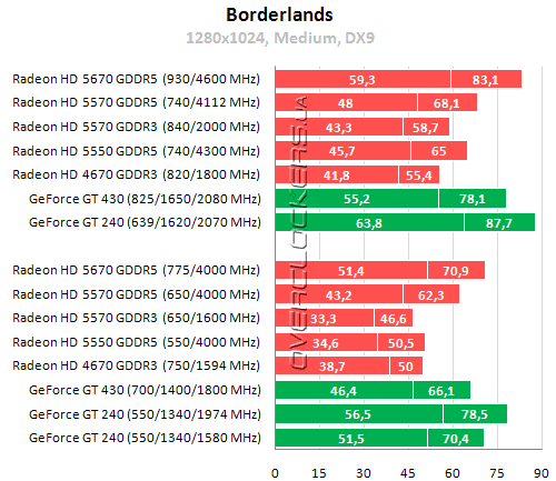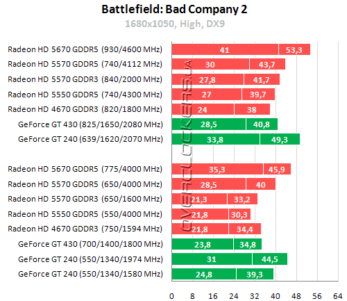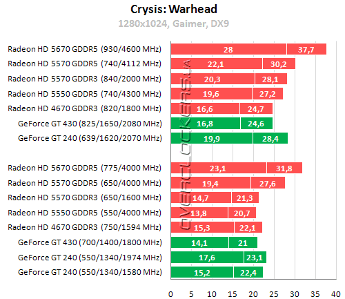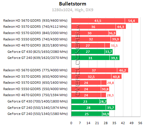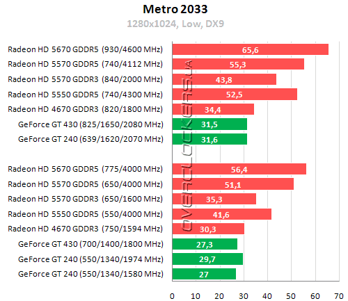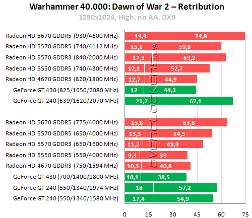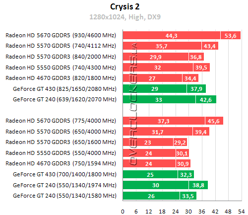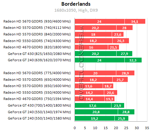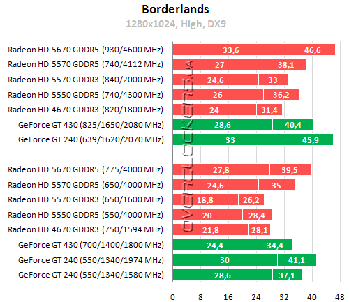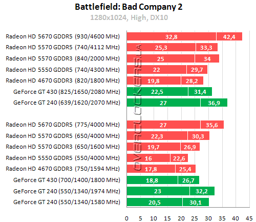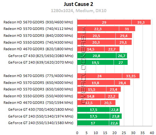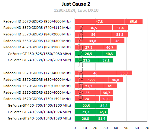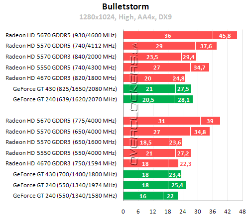 С более высоким разрешением справляются старшие Radeon и GeForce GT 240 на частотах 550/1340/1974 МГц. При разгоне приемлемые результаты демонстрируют Radeon HD 5570 GDDR3 и GeForce GT 430.