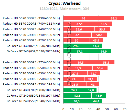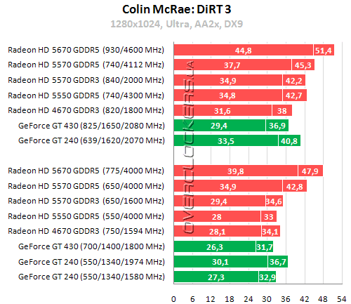 Высокое разрешение при максимальных настройках качества оказывается не по силам всем видеокартам. Но при разгоне GeForce GT 240 и Radeon HD 5670 демонстрируют более-менее приемлемый результат. В номинале между ними тоже минимальная разница в производительности. GT 430 проигрывает Radeon HD 5570 GDDR5, но уверенно удерживает преимущество над картой с GDDR3.