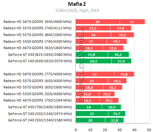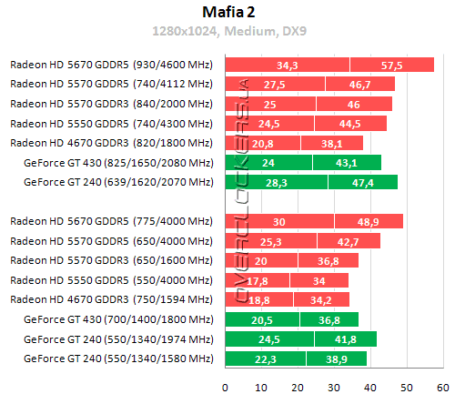 При средних настройках качества все выглядит иначе. Radeon HD 5550 уже уступает GeForce GT 430, а Radeon HD 5550 GDDR3 оказывается слабее GeForce GT 240. Впрочем, результаты все равно низкие и нормально поиграть при таких настройках позволяет лишь Radeon HD 5670. Mafia 2