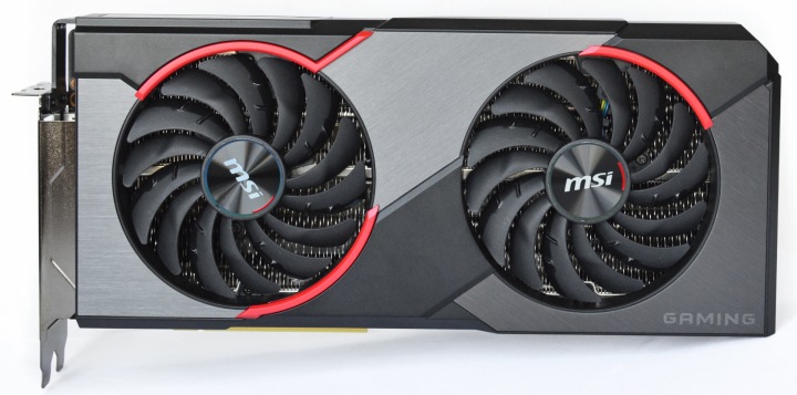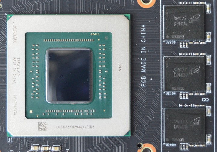 На плате распаяно шесть микросхем Micron 9RA77 D9WCW. Шесть гигабайт памяти работают с 192-битной шиной. Процессор Navi 10 урезан с 2560 до 2304 потоковых ядер.