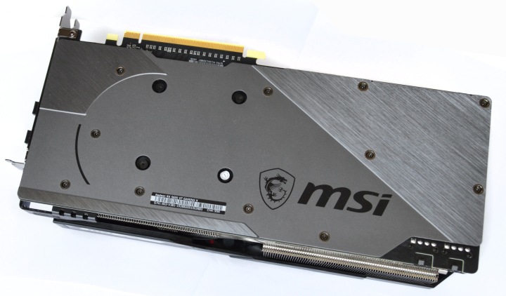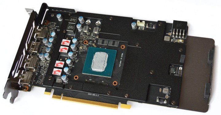 Задняя пластина участвует в охлаждении благодаря трем массивным термопрокладкам, которые расположены под зоной графического чипа и чипов памяти.