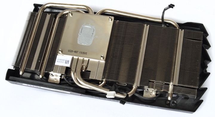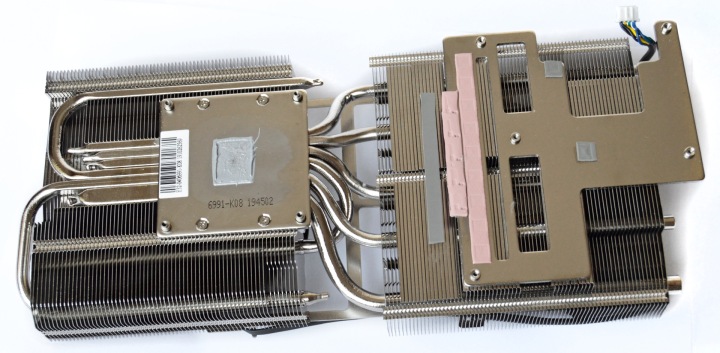 Контакт с графическим чипом осуществляется через ровное основание. Шесть тепловых трубок распределяют тепло по массивному радиатору, который состоит из двух секций пластин. У второй секции есть контактная площадка для отвода тепла от элементов питающей цепи.