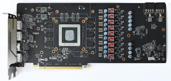 Печатная плата крупнее, чем у старшего варианта NVIDIA, но система питания проще. Бросается в глаза наличие в текстолите большого логотипа в форме дракона. Графический процессор запитан от трехфазного преобразователя напряжения.