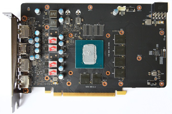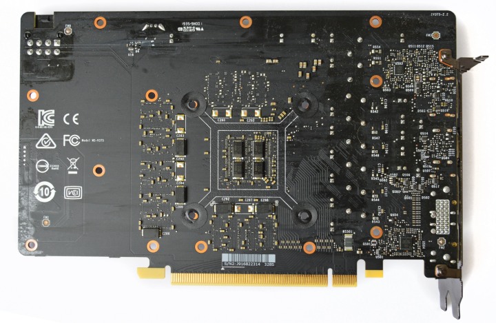 Плата короткая, как и у многих представителей серии GeForce GTX 1660. Задняя пластина не имеет термопрокладок, не охлаждая горячие зоны платы.