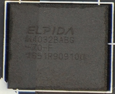 Распаяно восемь микросхем памяти Elpida W4032BABG-70-F. Такие чипы можно встретить на Radeon RX 570. К сожалению, у нас не сохранилось хорошего целостного изображения, ниже приведен коллаж из двух фрагментов, на котором видно маркировку.