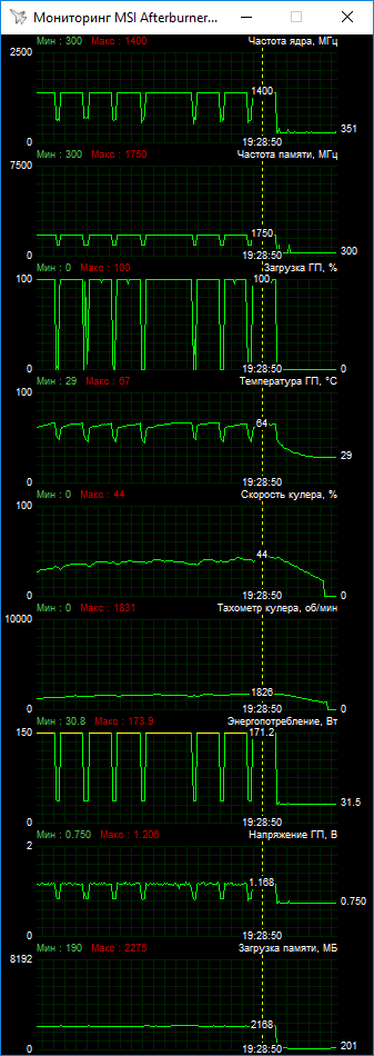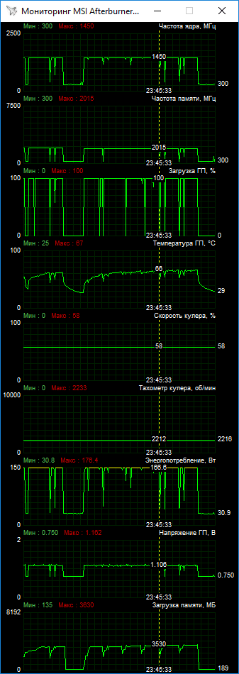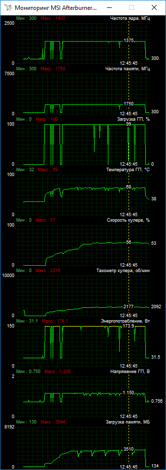 Разгон до частот 1450/8060 МГц сопровождался повышением лимита мощности. Скорость вентиляторов была зафиксирована на уровне 2200 об/мин, что помогло поддерживать температуры ядра ниже 66 °C, хотя уровень шума был высоковат.