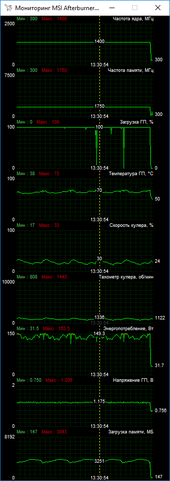 Обратите внимание, что температуры ниже 70 °C. А вот при прохождении нескольких прогонов бенчмарка Assassin's Creed Origins ядро достигало 73 °C при скорости вентиляторов 1200–1400 об/мин.