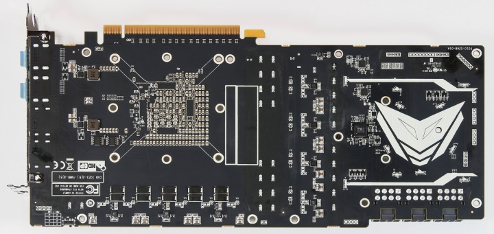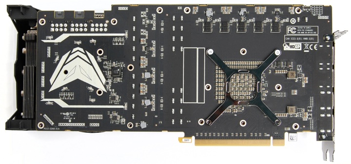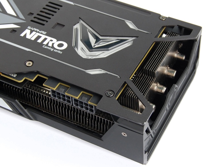 Обратная сторона закрыта металлической пластиной. На поверхность нанесен небольшой геометрической узор и логотип Sapphire Nitro. Есть прорези для крупных элементов на плате.