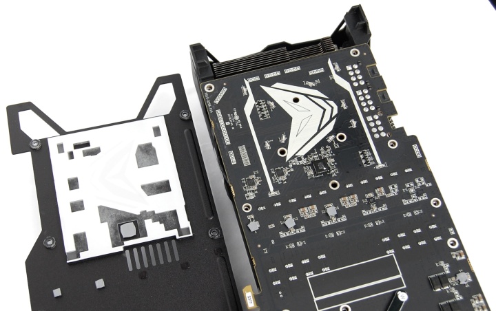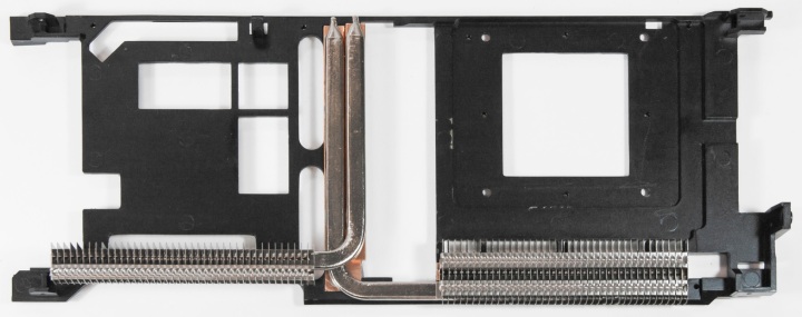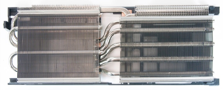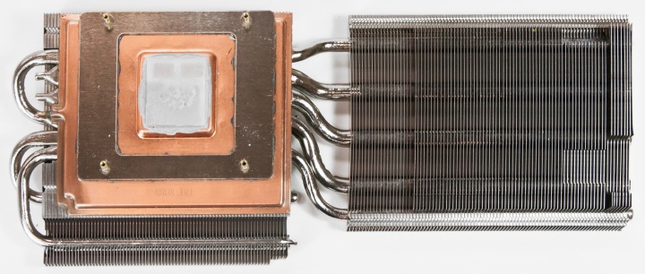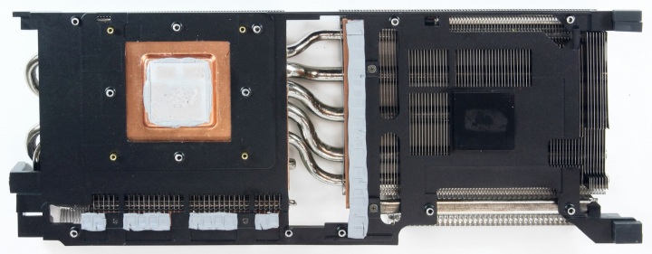 Основанием радиатора GPU является массивная медная испарительная камера со специальной контактной площадкой для графического кристалла. Испарительная камера несет на себе все тепловые трубки и секцию пластин. Вторая секция, пронизанная трубками, нависает над платой.