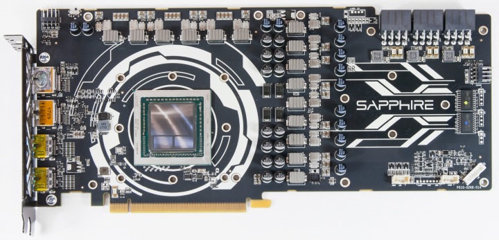 В нашем распоряжении нет фотографий печатной платы Sapphire Nitro+ Radeon RX Vega 56. Но для иллюстрации можно воспользоваться фотографиями от Sapphire Nitro+ Radeon RX Vega 64. Видеокарты используют PCB идентичного дизайна, но наша версия, как младшая модель, может иметь какие-то упрощения.