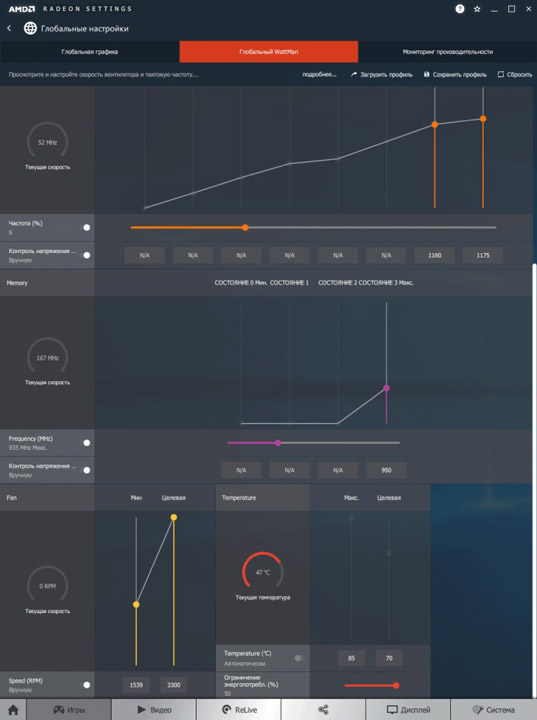 Для лучшего охлаждения были ускорены вентиляторы. Через настройки Radeon Wattman задается минимальная и максимальная скорость. В итоге средняя скорость в играх составила около 1800 об/мин. По шуму это вполне терпимо, но скачки скорости при старте приложений весьма ощутимы. Также надо отметить, что работа при выбранных частотах была на идеальна, но в целом мы прошли все тесты почти без сбоев. Разгон Radeon Vega всегда сопряжен с оговорками по стабильности, особенно в отношении референсных моделей, которые мы вообще не рекомендуем разгонять. Тут разгон применим, что для длительного использования нужно больше времени на подбор оптимальных настроек — например, снизить максимальные частоты в пользу более низкого напряжения.