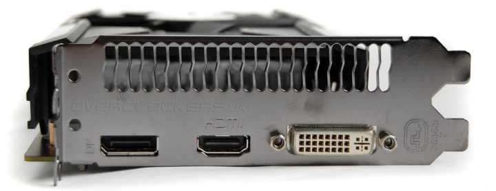 На задней панели расположено три интерфейсных видеоразъема: DipslayPort, HDMI и DVI.