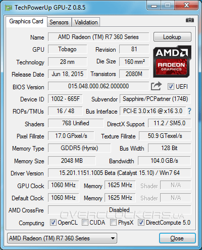 Рабочие частоты Sapphire Nitro R7 360 2G D5 слегка повышены. Чип работает на 1060 МГц, эффективная частота памяти соответствует стандартным предписаниям в 6500 МГц (физическое значение 1625 МГц).