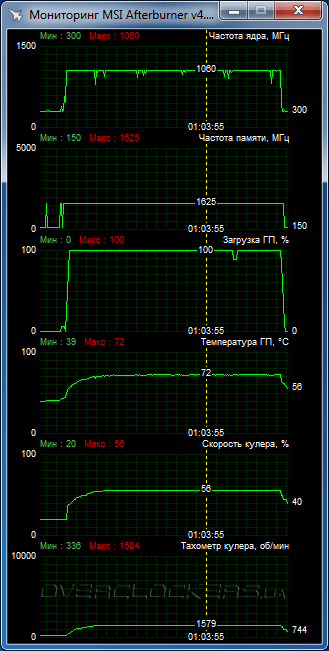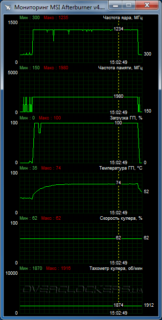 При игровой нагрузке ядро видеокарты прогревалось не выше 72 °C при 24 °C в помещении. Максимальная скорость вращения охлаждающего вентилятора достигала значения 1580 об/мин. Шум слабый. Ниже в качестве наглядного примера приведен скриншот мониторинга параметров во время тестирования Metro: Last Light.