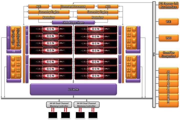 Процессор Tobago, он же Bonaire в прошлом, базируется на архитектуре GCN версии 1.1. Его вычислительная мощь обеспечивается 14 Compute Unit с 896 потоковыми процессорами и 56 текстурными блоками. Работа с внешней памятью обеспечивается двумя контроллерами по шине общей разрядностью 128 бит.