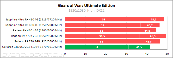 Первый тест под DirectX 12 и еще одна требовательная к памяти игра. Тут последнее место занимает GeForce GTX 950. У Radeon RX 460 и Radeon R9 270 минимальная разница в результатах при рекомендованных частотах. Но у старых представителей AMD при высоком качестве текстур наблюдалась проблема, когда некоторые детализированные текстуры просто не подгружались. Картинка на GeForce GTX 950 была более корректной. Идеальным выбором станет новый Radeon с 4 ГБ памяти. Разгон укрепляет его позиции на 8%.