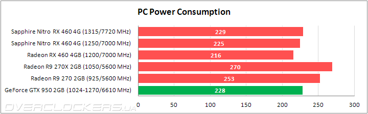 Самые низкие показатели у Radeon RX 460 на базе 14-нм чипа Polaris 11. В разгоне энергопотребление Radeon RX 460 сопоставимо с потреблением GeForce GTX 950 в номинале. Но тут надо учитывать небольшой софтвольтмод, который применялся для Sapphire.