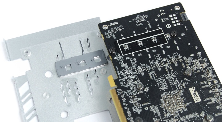 Взглянем ближе на систему охлаждения. Начнем с задней пластины. Это не просто «бэкплейт», который защищает плату и придает жесткости всей конструкции. Пластина включена в общий теплообмен благодаря трем крупным термопрокладкам, которые контактируют с платой в районе узла питания. То есть, это большой радиатор для самой платы. Зона контакта обозначена на текстолите белой рамкой.
