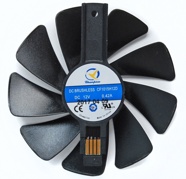 Снять вентиляторы еще проще. Благодаря системе Quick Connect они обходятся без проводов. Есть контактная площадка и один фиксирующий болт. Поэтому изъятие вентиляторов для профилактики возможно без демонтажа пластикового корпуса. Маркировка вентиляторов CF1015H12D, используется двойной шарикоподшипник, диаметр крыльчатки 95 мм