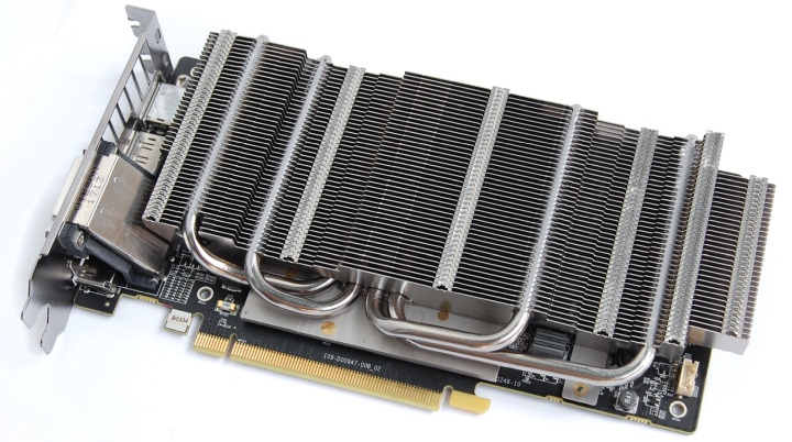 Радиатор набран из массива тонких пластин, в конструкции задействовано четыре тепловые трубки.