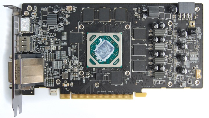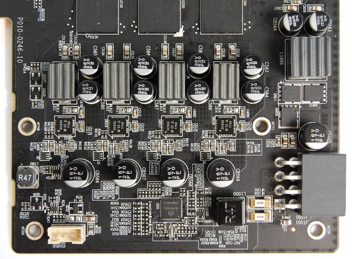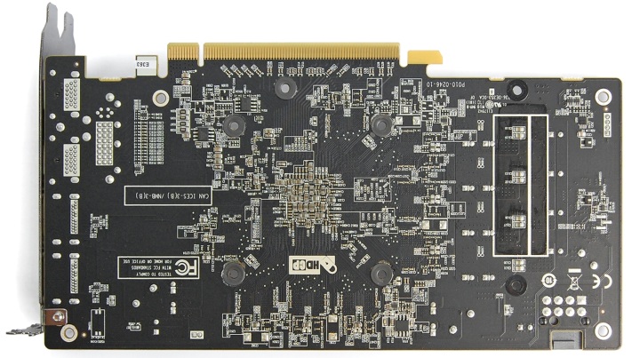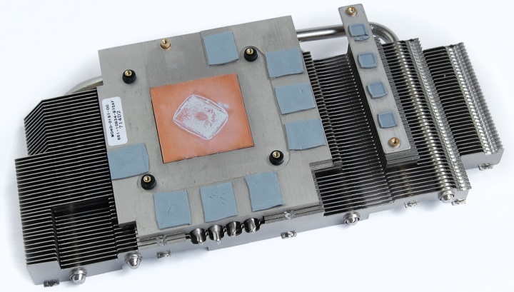 Контакт с поверхностью графического чипа осуществляется через медную пластину. Вокруг крупное основание, которое контактирует с микросхемами памяти. Отдельного радиатора для узла питания нет, специальная контактная площадка для силовых элементов присутствует прямо на основном радиаторе.