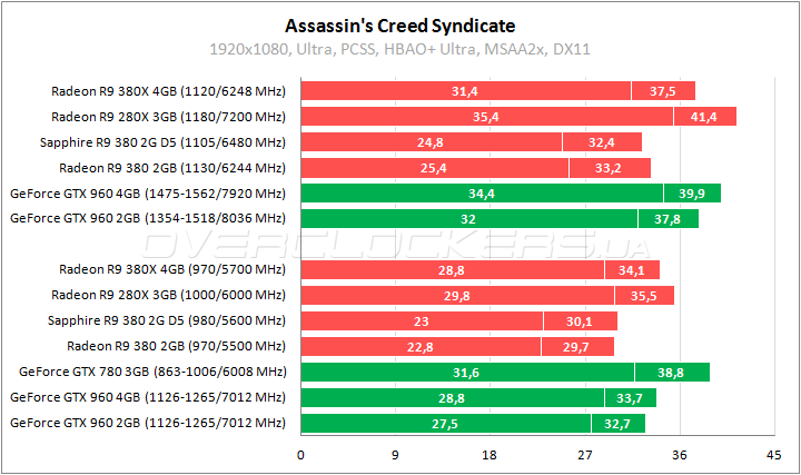 В последней игре серии Assassin's Creed важную роль играет объем памяти, что обуславливает значительное отставание Radeon R9 380 от Radeon R9 380X. Хотя между двумя версиями GeForce GTX 960 разница меньше. И даже самая простая карта NVIDIA с 2 ГБ оказывается быстрее нашего героя.
