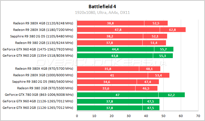 Sapphire на одном уровне с GeForce GTX 960 по средней частоте кадров в Battlefield 4. По минимальному параметру скромное преимущество конкурента. Также очень скромное отставание Sapphire от Radeon R9 380X, и это актуально как для начальных частот, так и для разгона.