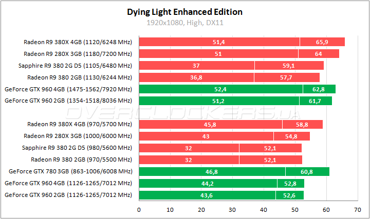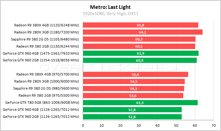 В Last Light Sapphire не уступает Radeon R9 280X и на 3% обгоняет GeForce GTX 960. Отставание от старшего Radeon R9 380X легко перекрывается разгоном. Разгон позволяет приблизиться к результатам GeForce GTX 780 в номинале.