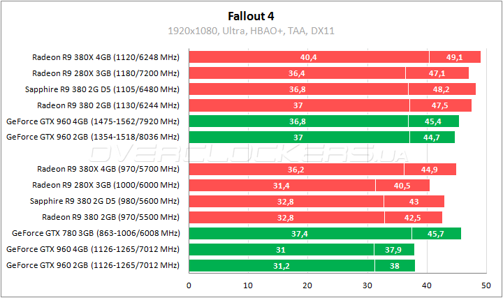 Около 1% выигрывает Sapphire у товарища в Fallout 4 и на 13% лучше по средней частоте кадров конкурента GeForce GTX 960. Приятно отметить, что изначально Radeon R9 380 производительнее Radeon R9 280X. Отставание Sapphire от Radeon R9 380X на уровне 4–10%. В разгоне герой обзора быстрее ускоренного видеоадаптера Radeon R9 280X и товарища по серии.