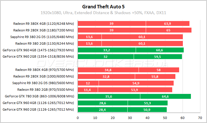 По средней частоте кадров в GTA 5 мы видим преимущество Radeon R9 380 над GeForce GTX 960, но по минимальному параметру лучше конкурент. Малый объем памяти вновь ограничивает потенциал графического ускорителя AMD. И снова память не играет существенной роли для GeForce GTX 960. Поэтому и дальнейший рост производительности при разгоне упирается в серьезные просадки fps. Тем не менее, показатели у Radeon R9 380 высокие, и если будут какие-то лаги в игре, то они решатся снижением дальности отрисовки улучшенных теней и детализации.