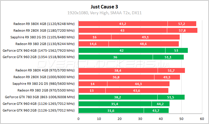 Игра Just Cause 3 задействует около 3 ГБ при максимальном качестве. Для GeForce GTX 960 это не сильно критично, и даже при 2 ГБ нет серьезных просадок fps. А вот Radeon R9 380 с 2 ГБ при аналогичном среднем fps испытывает серьезные трудности в отдельные игровые моменты во время резких движений и разворотов камеры. Поэтому видеокарта не может обеспечить комфорт при Ultra-качестве, но небольшая настройка параметров это легко исправит.
