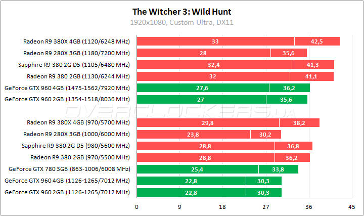 Триумф видеоадаптеров AMD последнего поколения в Witcher 3. Даже самый простой Radeon R9 380 производительнее Radeon R9 280X и GeForce GTX 780, не говоря уже о GeForce GTX 960. Небольшая разница между Radeon R9 380 и Radeon R9 380X легко компенсируется разгоном младшего представителя. Да и при сравнении форсированных Sapphire и Radeon R9 380X выигрыш последнего весьма скромный.