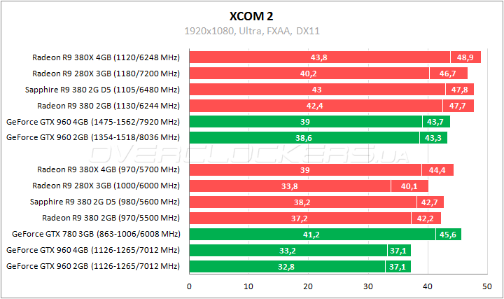 В данном тесте разница между двумя Radeon R9 380 даже больше, чем в некоторых реальных играх — на уровне 2%. В разгоне Sapphire быстрее напарника на 1,4%. У GeForce GTX 960 небольшое преимущество при сравнении на начальных частотах и более серьезное после разгона. Сам разгон Sapphire легко позволяет превзойти показатели Radeon R9 380X с начальными частотами.