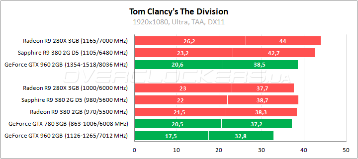 Новая игра в нашем тестировании. Тесты проводились для тех видеокарт, что были в наличии, но с новыми видеодрайверами. Ситуация в The Division для AMD чрезвычайно удачная. Даже при рекомендованных частотах Radeon R9 380 быстрее GeForce GTX 960 и GeForce GTX 780. Эти показатели близки к Radeon R9 280X в номинале, но у предшественника преимущество при разгоне. Кстати, The Division вынудил сбросить разгон Radeon R9 280X, даже на указанных частотах пройти тест удалось с несколькими вылетами, не говоря уже о более высоких значениях. Игра оказалась самым крепким «орешком» для старого Radeon.