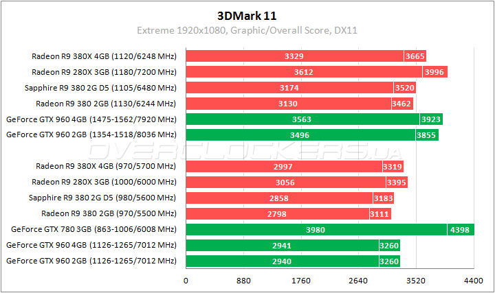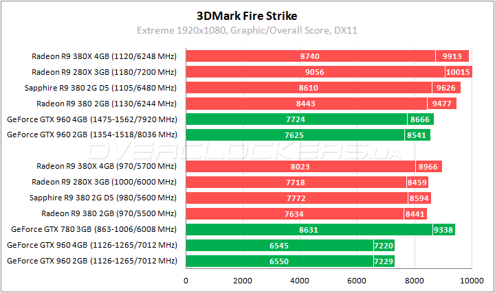 Уверенное преимущество относительно GeForce GTX 960 при привычном минимальном отставании от Radeon R9 380X. В разгоне Sapphire быстрее аналогичной карты с более высокой частотой ядра, но меньшими частотами памяти. Повышение частот до предела позволяет минимизировать отставание от Radeon R9 280X и GeForce GTX 780.