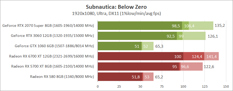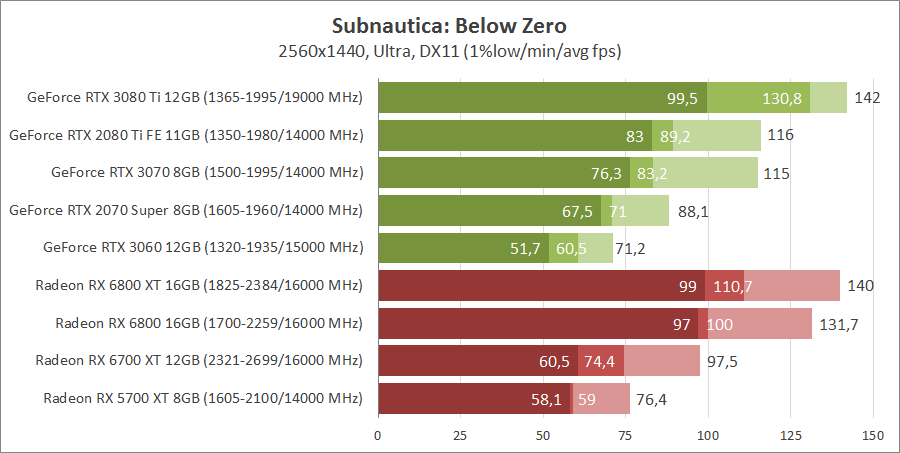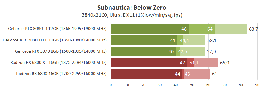 Чтобы насладиться подводным миром в Subnautica: Below Zero при стандартном разрешении Full HD не нужны топовые видеокарты. С этой задачей справятся старые GeForce GTX 1060 и Radeon RX 580, но для полного комфорта нужны более производительные модели. С разрешением 2560x1400 справляются GeForce RTX 3060, Radeon RX 5700 XT и все более мощные решения. А вот в 4K игра уже представляет серьезную нагрузку, даже GeForce RTX 2080 TI с Radeon RX 6800 являются минимальным выбором для высокого разрешения. Комфортную производительность при стабильных 60 кадрах и выше в таком режиме обеспечат GeForce RTX 3080 и GeForce RTX 3080 Ti. Эти видеокарты имеют серьезное преимущество над Radeon RX 6800 XT.