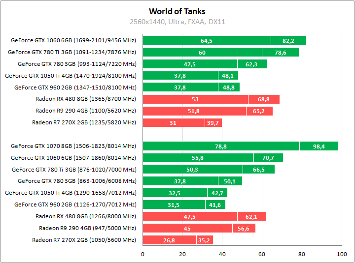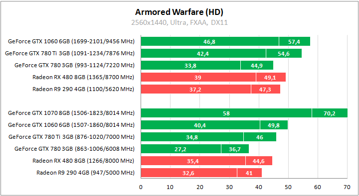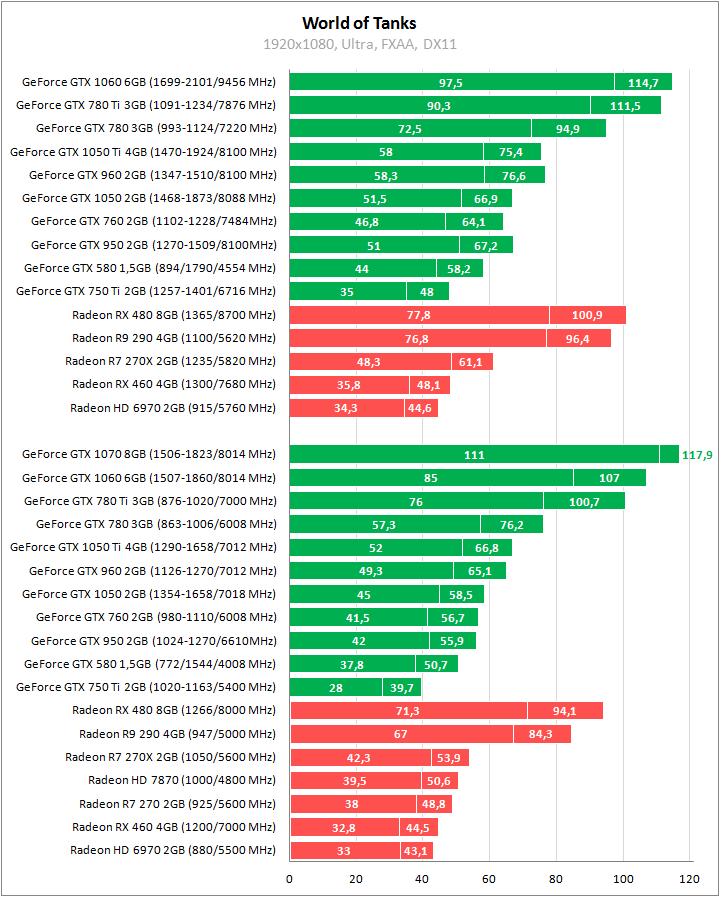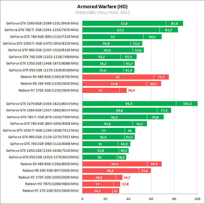 При максимальных установках качества неплохие результаты выдают даже бюджетные решения. В конце рейтинга Radeon HD 6970, более высокие показатели у GeForce GTX 580 и GeForce GTX 750 Ti. Radeon R9 270X и Radeon RX 460 слабее GeForce GTX 950. Старый GeForce GTX 760 в номинале чуть лучше GeForce GTX 1050. В отрыве от них GeForce GTX 960 и GeForce GTX 1050 Ti, с такими видеоадаптерами можно рассчитывать на 60 fps на большинстве игровых карт. GeForce GTX 780 в номинале демонстрирует более высокую производительность в сравнении с Radeon R9 290, а при разгоне нагоняет Radeon RX 480 при начальных частотах. GeForce GTX 780 Ti изначально быстрее Radeon RX 480. Новый GeForce GTX 1060 быстрее GeForce GTX 780 Ti на 12–14%, и этот представитель NVIDIA уже не имеет равного конкурента среди современных решений AMD.