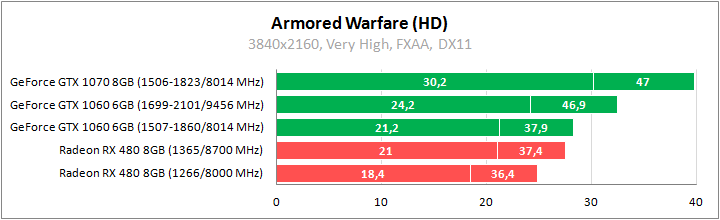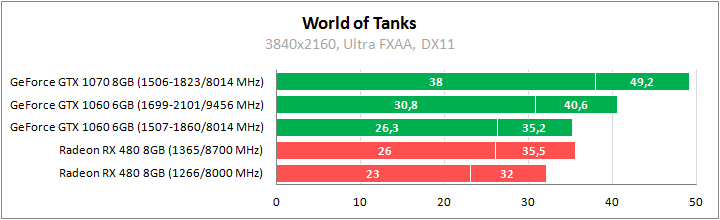 Завершим изучение производительности сравнением Radeon RX 480, GeForce GTX 1060 и GeForce GTX 1070 в сверхвысоком разрешении 4K (3840x2160).