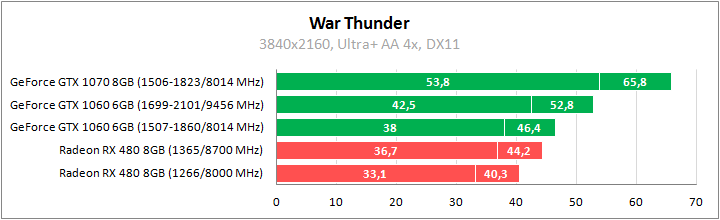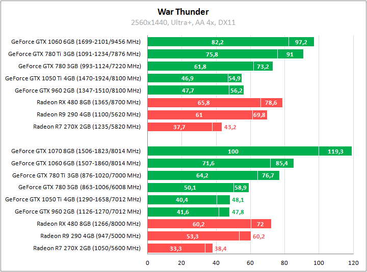Производительность бюджетных представителей в таком режиме ниже, чем в War Thunder. Требовательного игрока устроят видеоадаптеры уровня GeForce GTX 780 Ti или Radeon RX 480 (второй слабее). GeForce GTX 1060 выигрывает у старшего Radeon около 13–17%. Отрыв GeForce GTX 1070 от GeForce GTX 1060 под 40%. Загрузка видеопамяти уже более 2 ГБ, при долгих игровых сессиях может быть еще выше.