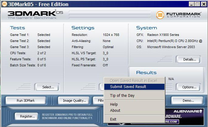 2 - На компьютере, который имеет доступ в Интернет, Вам нужно запустить 3DMark той же версии, что установлен у Вас и, нажав на любой части окна пакета правую кнопку мыши, выбрать пункт Submit Saved Result.