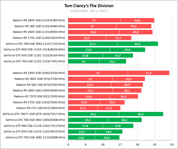 Мы видим серьезную разницу между минимальным и средним fps. Но тут надо отметить, что в реальной игре аналогичные просадки крайне редки, хотя и возможны. Минимум производительности приходится на момент, когда в кадре горящий автомобиль с густым дымом. Из решений NVIDIA при стандартных частотах даже GeForce GTX 960 не вытягивает режим максимального качества графики. Но после разгона этот видеоадаптер выдает около 40 fps, хотя и при невысоком минимальном fps.