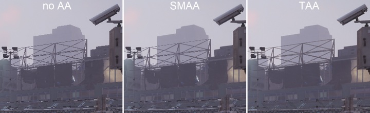 Тонкие конструкции сохраняют ступенчатую структуру и при SMAA, хотя и в меньшей степени. TAA это полностью нейтрализует, но некоторые дальние элементы действительно могут исчезнуть. Еще стоит обратить внимание на стыки объектов при общем сером фоне. Это лучше всего видно на первой иллюстрации. На стыке балок присутствует гребенка из-за отдельных темных пикселей. TAA полностью нейтрализует этот негативный эффект.